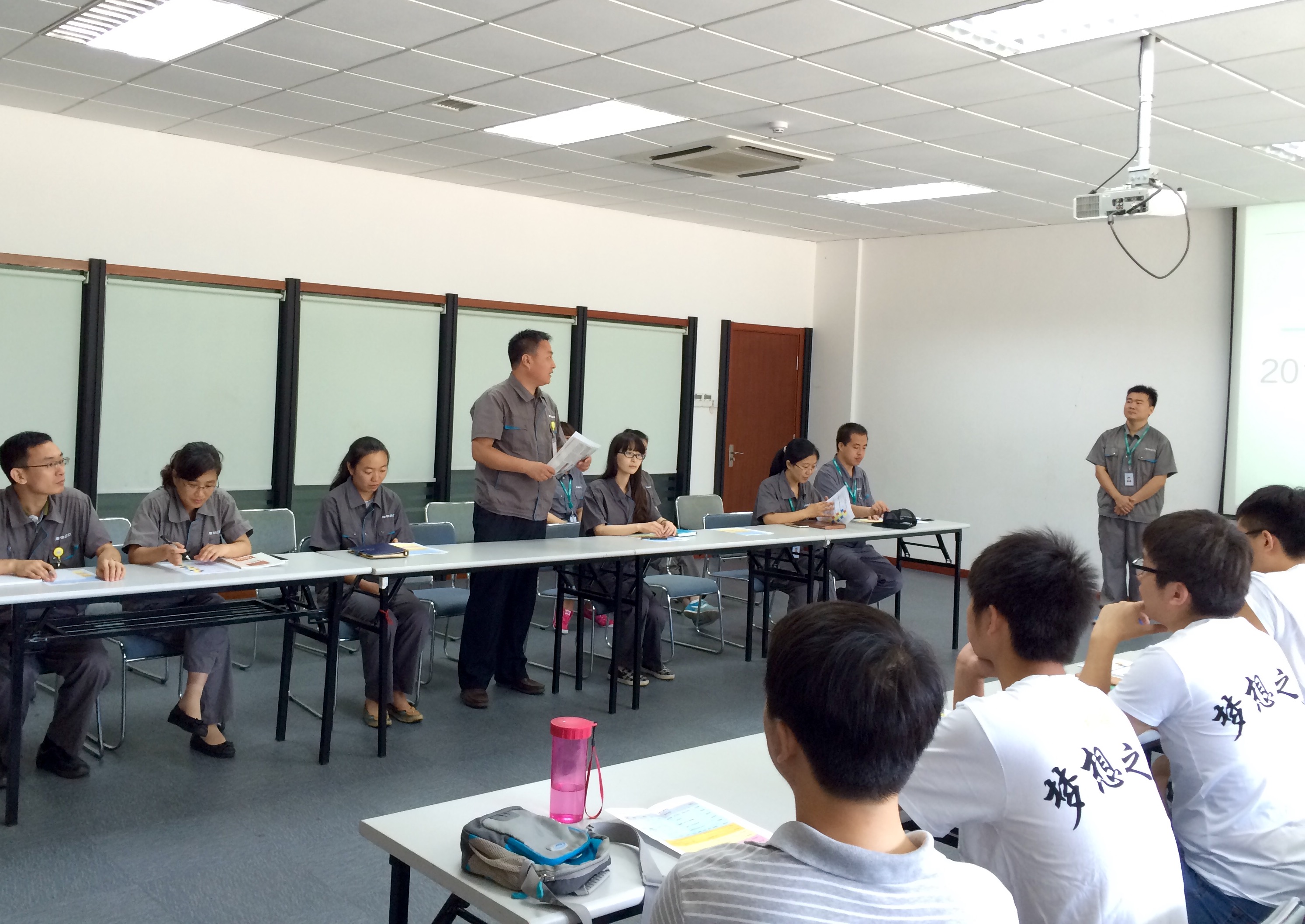 欢迎会结束之后,海信日立公司人力资源部张经世专员对本次实践的内容计划和规章制度进行了详细讲解。根据安排,本期夏季营包括见面日(meeting day)、实践日(practicing day)、技术日(utilizing day)、应用日(application day)和总结日(summary day),每天的活动安排各有侧重。为更好的发挥出每一名成员的能力,本期夏季营三十余名成员被分为五个小组,每支小组平行展开实践活动,在实践活动的最后一天以小组为单位进行总结总结展示。本着理论与实践相结合的宗旨,实践内容从理论学习和实际操作共同展开。一方面,公司安排了《海信日立情况及美女直播》《精益生产》《多联机的应用》和《暖通空调行业的发展趋势》四门课程;另一方面,夏季营成员须前往制造部、品保部(整机)和品保部(部品)的车间进行参观、学习和动手操作,加深对理论知识的理解,丰富对多联机空调零部件和制造过程的认识。